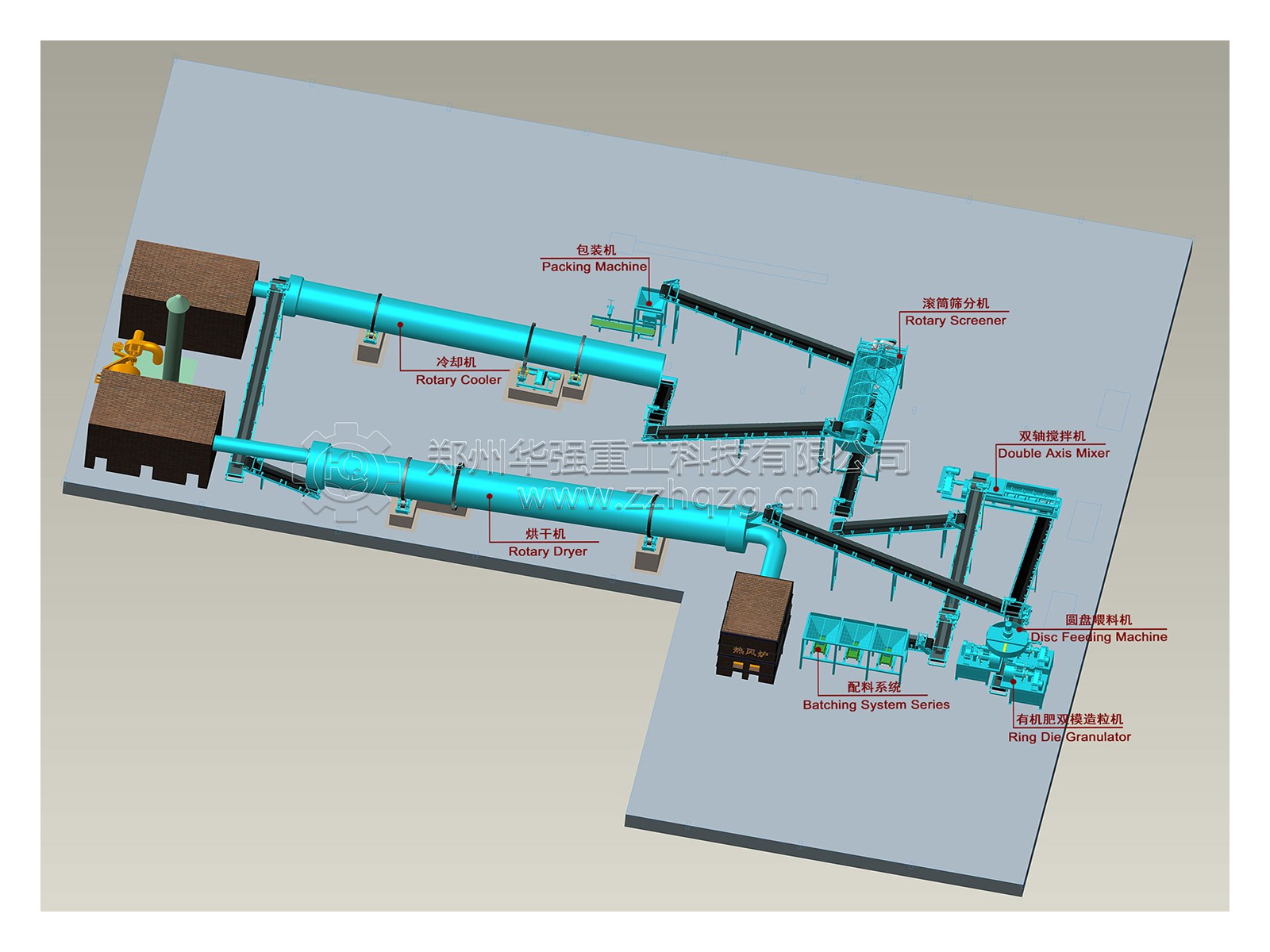 輪盤式發(fā)酵翻推機——配料系統(tǒng)——半濕物料粉碎機——雙軸攪拌機——除塵器——組合造粒機——烘干機——冷卻機——滾筒篩分機——包膜液電加熱熔爐攪拌罐——自動包裝。
