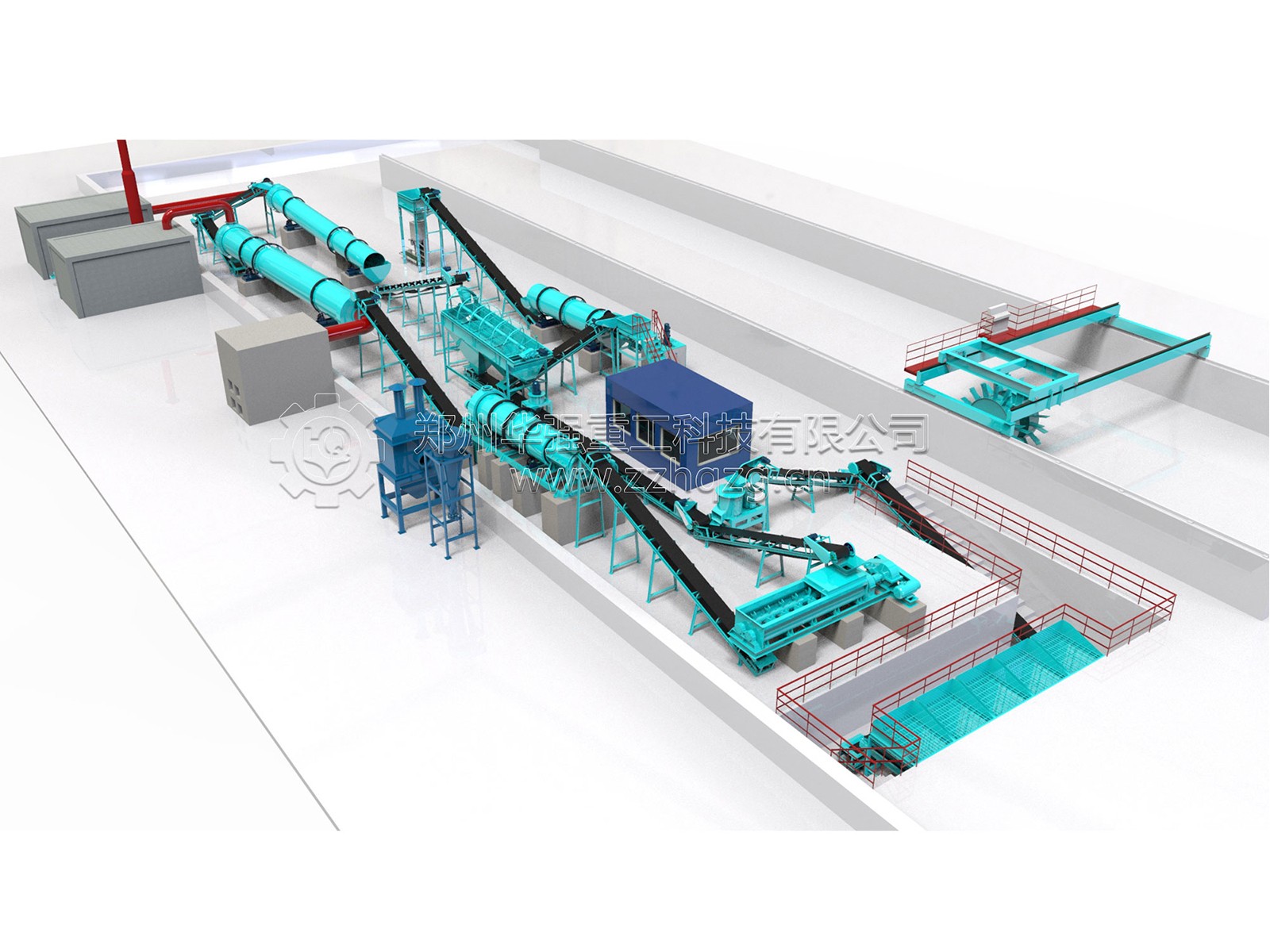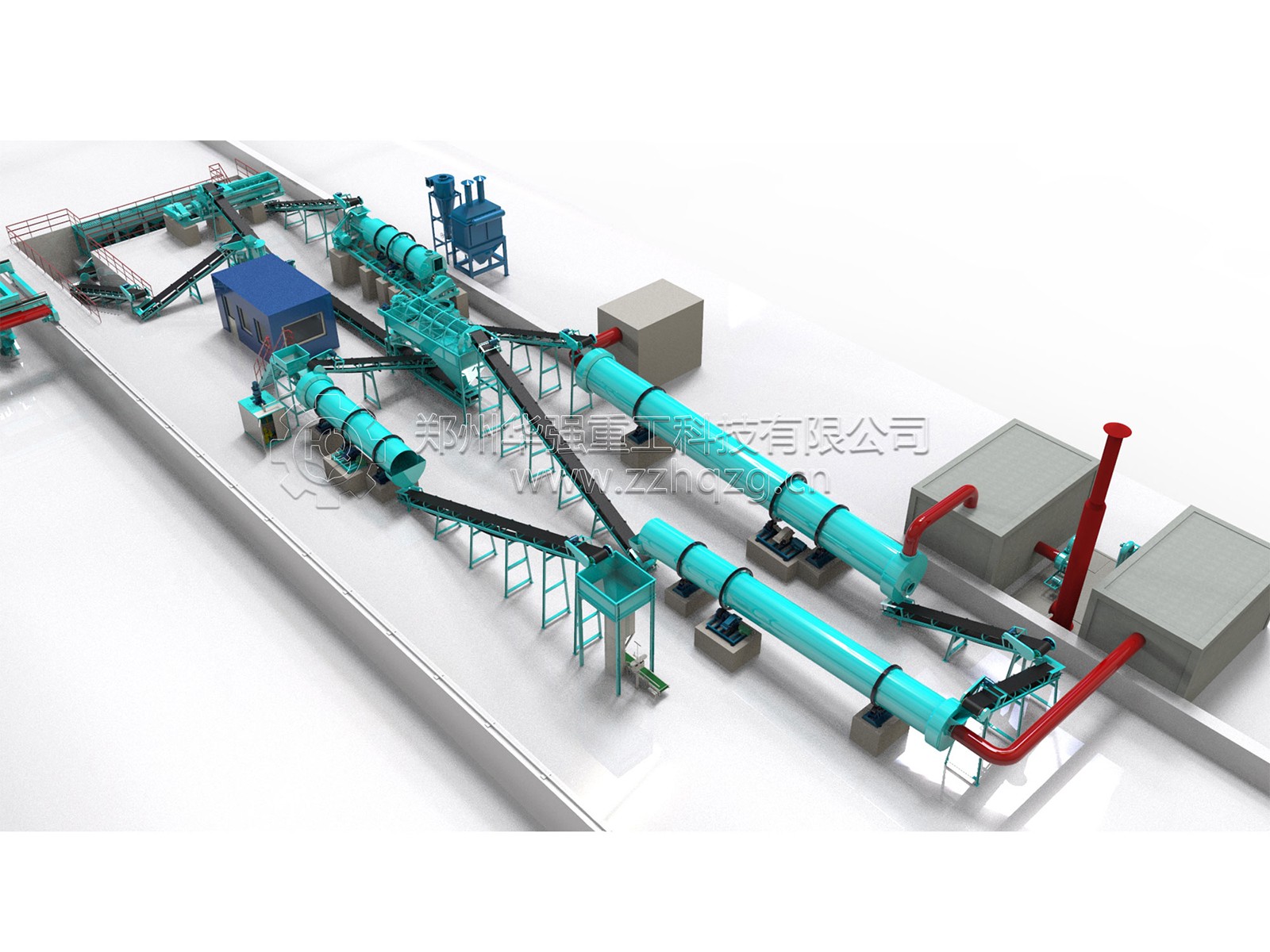 輪盤(pán)式發(fā)酵翻推機(jī)——配料系統(tǒng)——半濕物料粉碎機(jī)——雙軸攪拌機(jī)——除塵器——組合造粒機(jī)——烘干機(jī)——冷卻機(jī)——滾筒篩分機(jī)——包膜液電加熱熔爐攪拌罐——自動(dòng)包裝。
