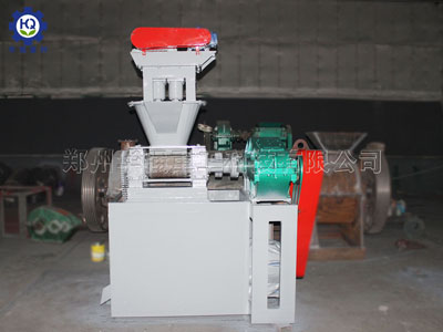 該系列對(duì)輥式造粒屬擠出滑模型,其工作原理是:由電動(dòng)機(jī)驅(qū)動(dòng)皮帶和皮帶輪,通過減速機(jī)傳遞給主動(dòng)軸,并通過對(duì)開式齒輪與被動(dòng)軸同步,相向工作。物料從進(jìn)料斗加入,經(jīng)對(duì)輥擠壓成型,脫模造球,并經(jīng)過一副鏈條,傳送到破碎篩工作室,篩下和分離成品顆(球)粒,然后返回料與新料混合,再進(jìn)行造粒。隨著電動(dòng)機(jī)連續(xù)轉(zhuǎn)動(dòng),物料的不斷進(jìn)入,方能實(shí)現(xiàn)批量生產(chǎn)。